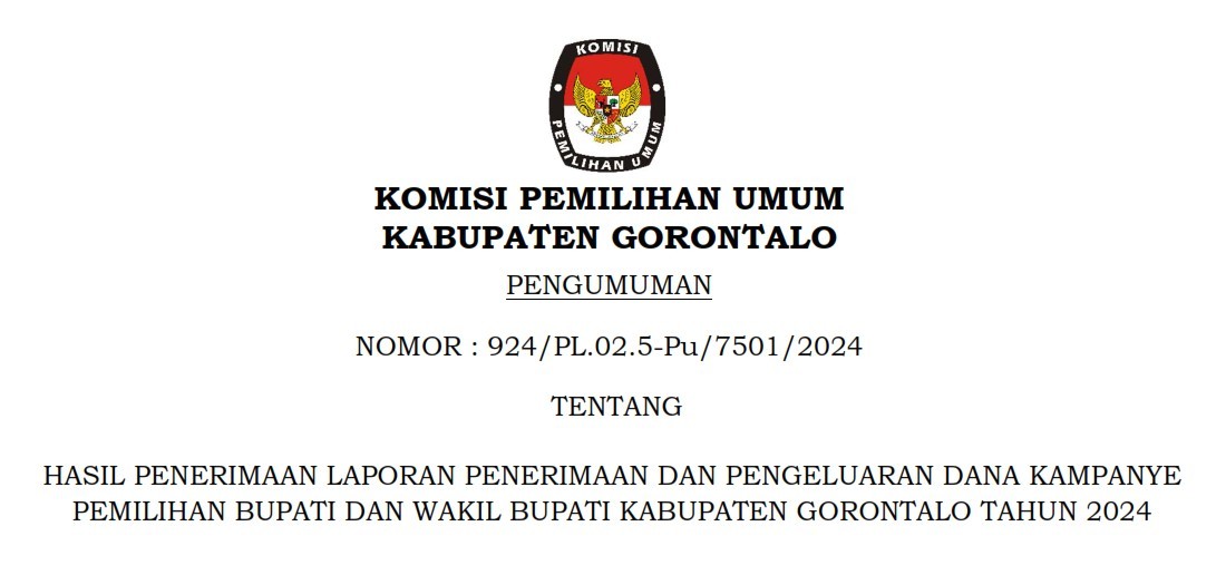 Pengumuman No. 924/PL.02.5-Pu/7501/2024 tentang Hasil Penerimaan Laporan Penerimaan dan Pengeluaran Dana Kampanye Pemilihan Bupati dan Wakil Bupati Kabupaten Gorontalo Tahun 2024