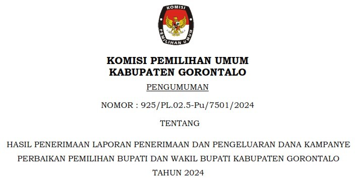 No. 925/PL.02.5-Pu/7501/2024 tentang Hasil Penerimaan Laporan Penerimaan dan Pengeluaran Dana Kampanye Perbaikan Pemilihan Bupati dan Wakil Bupati Kabupaten Gorontalo Tahun 2024