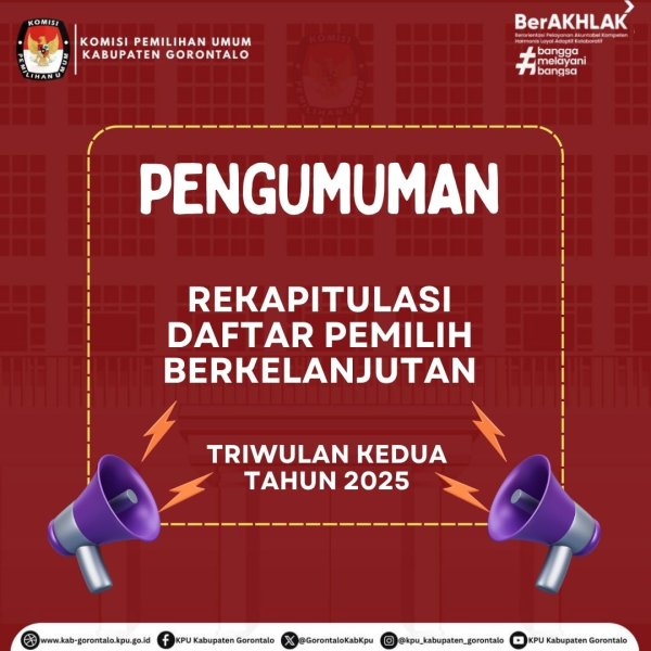 Kab. Gorontalo, 4 Desember 2024 - PENGUMUMAN NOMOR: 942/PL.02.6-Pu/7571/2024 TENTANG PENETAPAN REKAPITULASI HASIL PENGHITUNGAN SUARA PEMILIHAN BUPATI DAN WAKIL BUPATI GORONTALO TAHUN 2024 Berdasarkan  Rapat Pleno Terbuka Komisi  Pemilihan Umum Kabupaten Gorontalo telah selesai melakukan Rekapitulasi Hasil Penghitungan Suara Pemilihan Tahun 2024 pada tanggal 4 Desember 2024 Pukul 00.50 WITA. Berdasarkan Rekapitulasi  Hasil  Penghitungan   Suara   yang   tertuang dalam Berita Acara dan Sertifikat Rekapitulasi Hasil Penghitungan Suara dari Kecamatan dalam Pemilihan Gubernur dan Wakil Gubernur, Bupati dan Wakil Bupati Gorontalo Tahun 2024  diperoleh hal-hal sebagai berikut : 1. Hasil Rekapitulasi Pengumpulan suara Pemilihan Gubernur dan Wakil Gubernur Gorontalo Tahun 2024 tingkat Kabupaten Gorontalo 2. Hasil rekapitulasi Perolehan suara Bupati dan Wakil Bupati Gorontalo Tahun 2024 3. Salinan Keputusan Komisi Pemilihan Umum Kabupaten Gorontalo Nomor 1880 Tahun 2024 tentang Penetapan Hasil Pemilihan Bupati dan Wakil Bupati Kabupaten Gorontalo Tahun 2024
