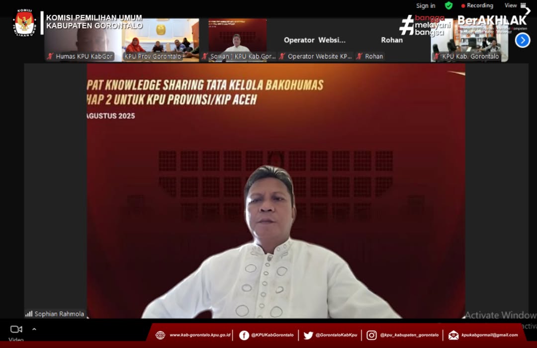 #TemanPemilih, Anggota KPU Kabupaten Gorontalo Divisi Sosidiklih dan Parmas Sowan S. Dehi, mengikuti rapat rutin evaluasi pengelolaan media sosial yang digelar oleh KPU Provinsi Gorontalo, dan diikuti oleh KPU kabupaten/kota se-Provinsi Gorontalo secara daring. Jumat, (29/08/2025).