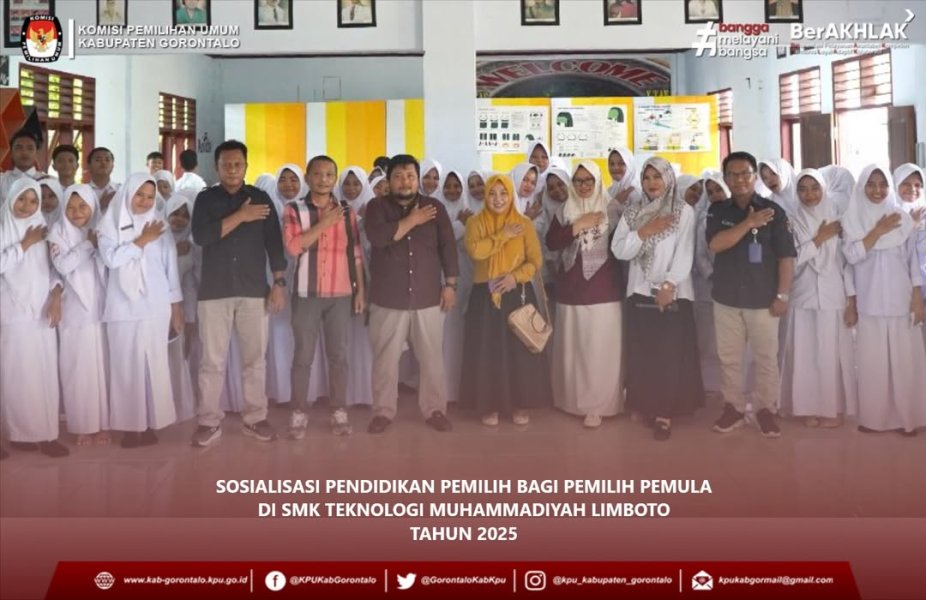 #TemanPemilih, Komisi Pemilihan Umum (KPU) Kabupaten Gorontalo menggelar Sosialisasi Pendidikan Pemilih Pemula di SMK Teknologi Muhammadiyah Limboto. KPU Kabupaten Gorontalo terus berkomitmen untuk meningkatkan dalam partisipasi generasi muda dalam Pemilu. Rabu, (8/10/2025).