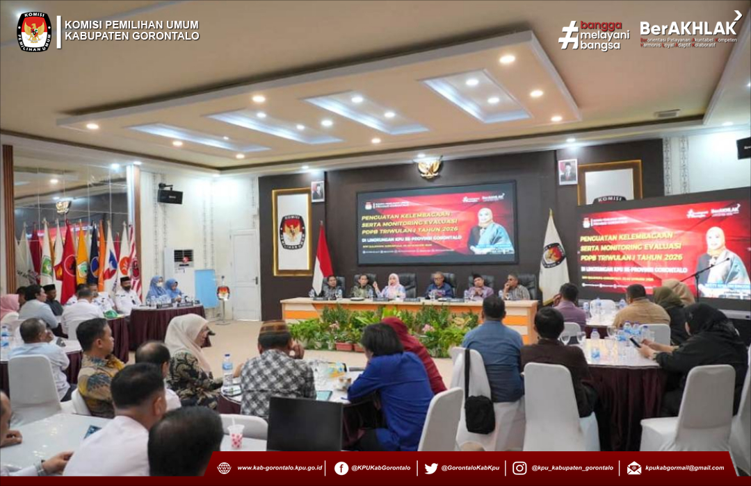 #TemanPemilih, Komisi Pemilihan Umum (KPU) Kabupaten Gorontalo menghadiri kegiatan Penguatan Kelembagaan serta Monitoring dan Evaluasi (Monev) Pemutakhiran Data Pemilih Berkelanjutan (PDPB) Triwulan I Tahun 2026 di lingkungan KPU se-Provinsi Gorontalo yang digelar di Aula KPU Provinsi Gorontalo, Rabu (22/01/2026).