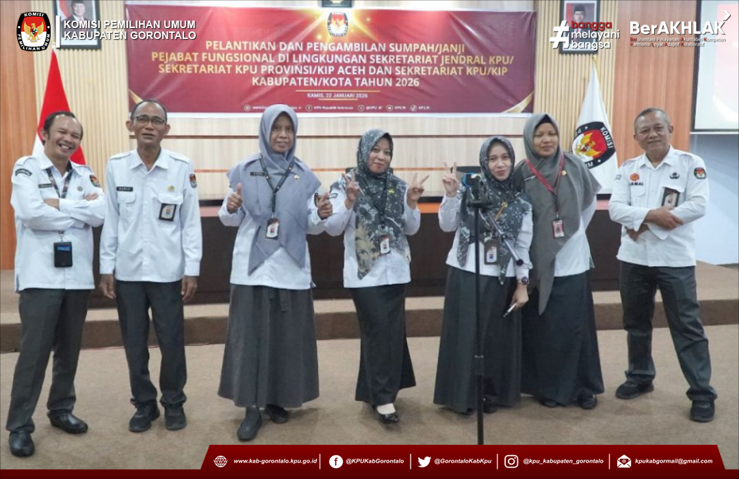 #TemanPemilih, Komisi Pemilihan Umum (KPU) Kabupaten Gorontalo mengikuti Pelantikan dan Pengambilan Sumpah/Janji Pejabat Fungsional Penata Kelola Pemilihan Umum di Lingkungan Sekretariat Jenderal KPU, Sekretariat KPU Provinsi/KIP Aceh, dan Sekretariat KPU/KIP Kabupaten/Kota Tahun 2026, di Aula KPU Kabupaten Gorontalo, Kamis (22/01/2026).