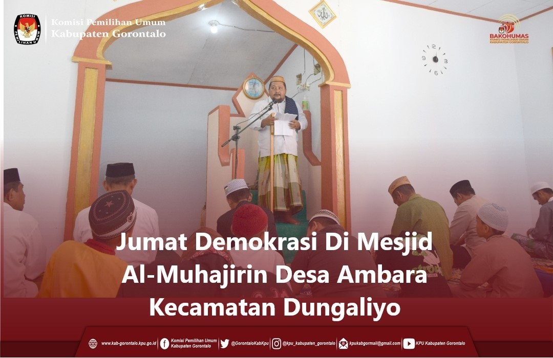 #TemanPemilih,. KPU Kabupaten Gorontalo melaksanakan kegiatan Jum'at Demokrasi, bertempat di Masjid Al-Muhajirin Desa Ambara Kecamatan Dungaliyo. Jumat, (27/05).