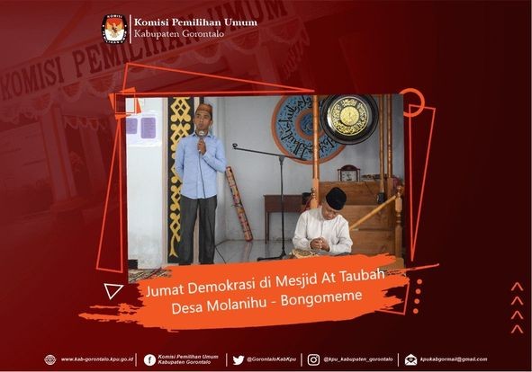 Kegiatan Jumat Demokrasi ini dihadiri oleh Anggota KPU Kabupaten Gorontalo Rasid H. Sayiu, Plt. Sekretaris KPU Kabupaten Gorontalo Friyanto Hatibie, S.IP, Kepala Desa Molanihu, Ketua Pengurus Takmirul Mesjid At-Taubah, dan jam'ah Mesjid At-Taubah Desa Molanihu Kecamatan Bongomeme.