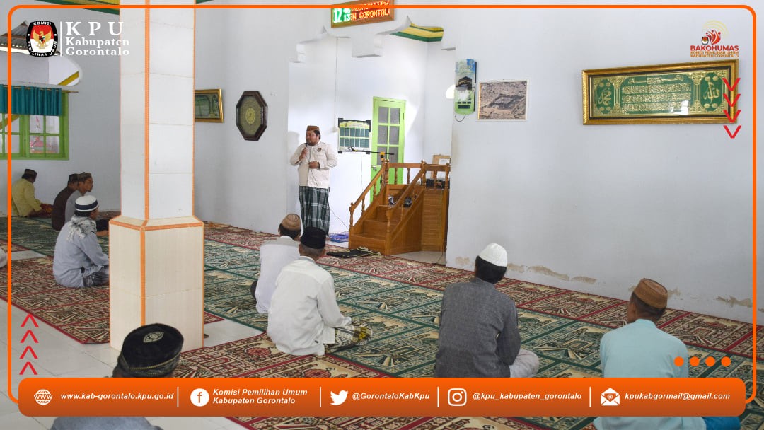 Kadir Mertosono anggota KPU Kabupaten Gorontalo Divisi Teknis penyelenggaraan Pemilu, selain melakukan sosialisasi setelah pelaksaanaan Sholat Jum'at, berliau juga berkenan bertindak selaku Khatib Jum'at, dalam Sosialiasinya.