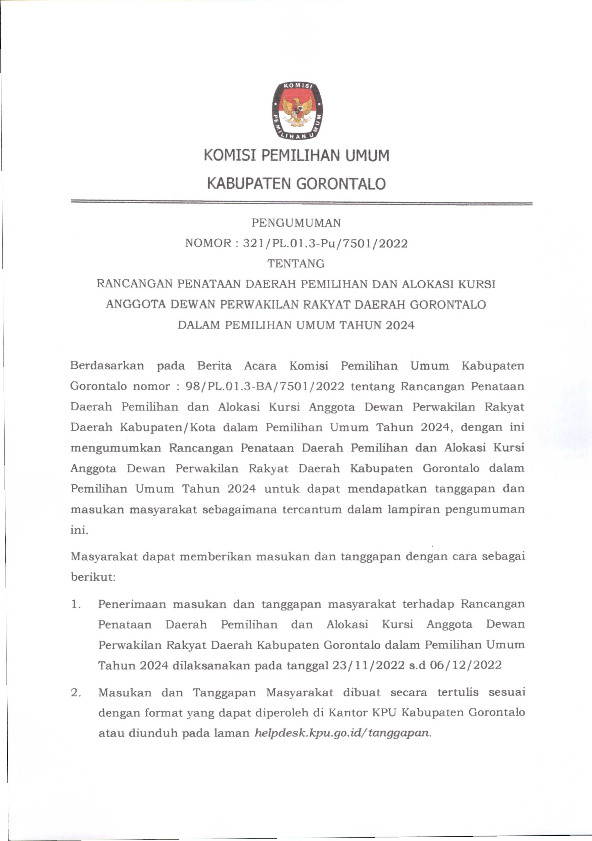 Pengumuman Nomor : 321/PL.01.3-Pu/7501/2022 tentang Rancangan Penataan Daerah Pemilihan dan Alokasi Kursi Anggota Dewan Perwakilan Rakyat Daerah Gorontalo dalam Pemilihan Umum Tahun 2024 berdasarkan pada Berita Acara Komisi Pemilihan Umum Kabupaten Gorontalo nomor : 98/PL.01.3-BA/7501/2022 tentang Rancangan Penataan Daerah Pemilihan dan Alokasi Kursi Anggota Dewan Perwakilan Rakyat Daerah Kabupaten/Kota dalam Pemilihan Umum Tahun 2024, dengan ini mengumumkan Rancangan Penataan Daerah Pemilihan dan Alokasi Kursi Anggota Dewan Perwakilan Rakyat Daerah Kabupaten Gorontalo dalam Pemilihan Umum Tahun 2024 untuk dapat mendapatkan tanggapan dan masukan masyarakat sebagaimana tercantum dalam lampiran pengumuman ini.