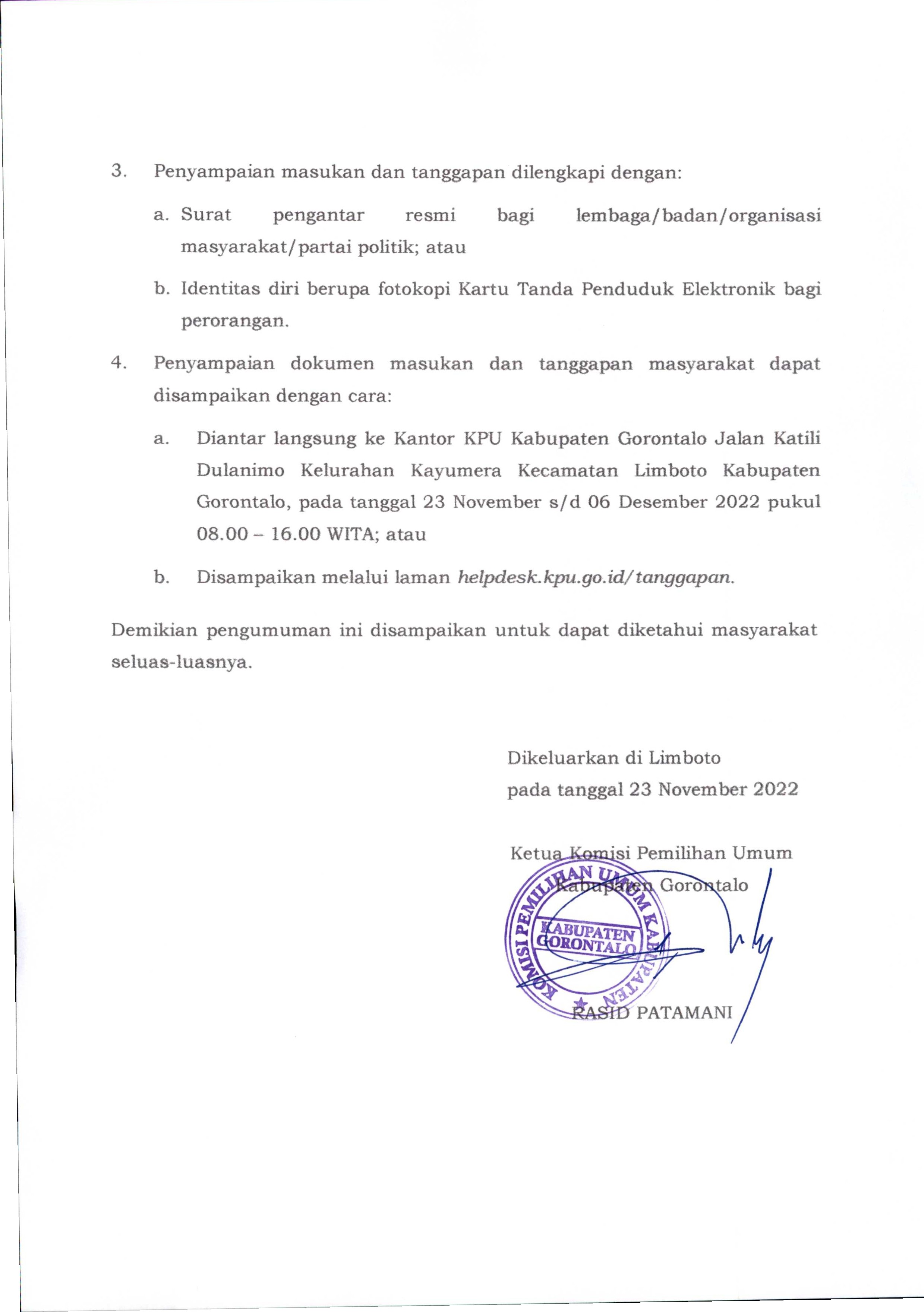 Terhadap Rancangan tersebut Masyarakat, Lembaga/Badan/Organisasi Masyarakat dapat memberikan masukan dan tanggapan sejak tanggal 23 November s.d 6 Desember 2022 pukul 08.00 wita. Masukan/Tanggapan diantar langsung dikantor KPU Kabupaten Gorontalo atau disampaikan melalui laman helpdesk.kpu.go.id/tanggapan dengan mengisi format dibawah ini: