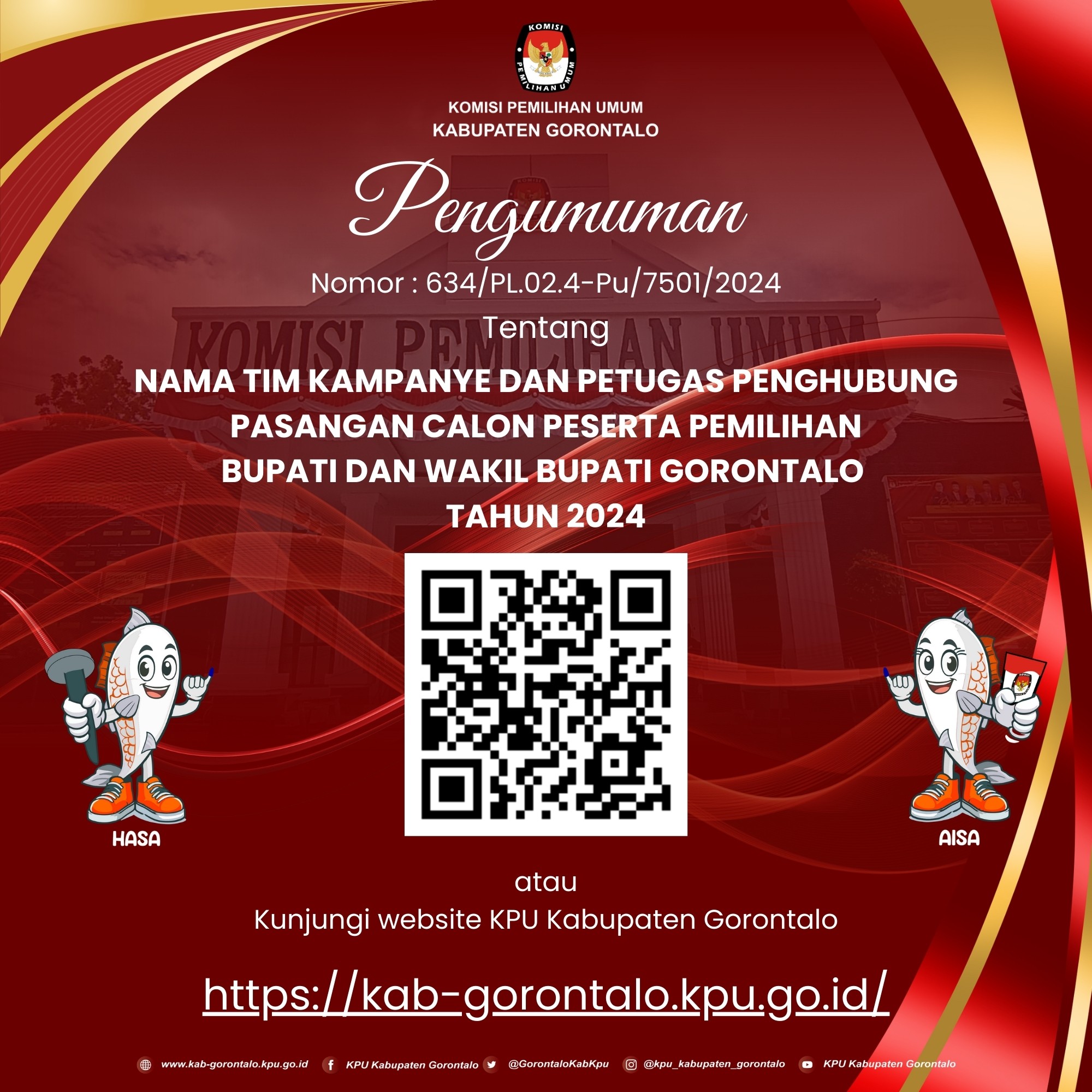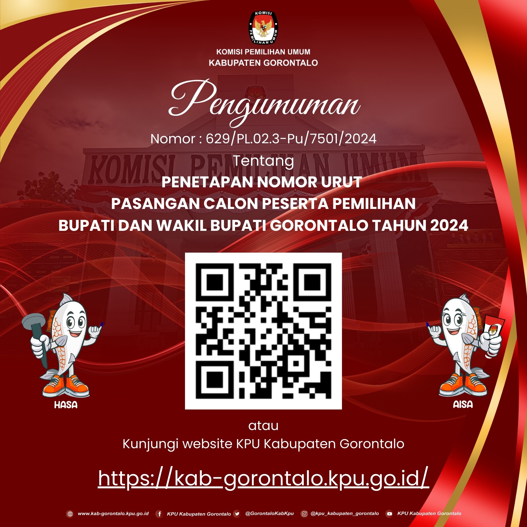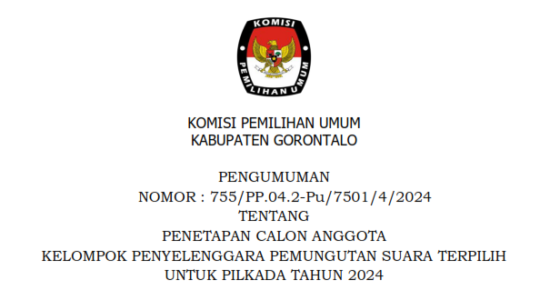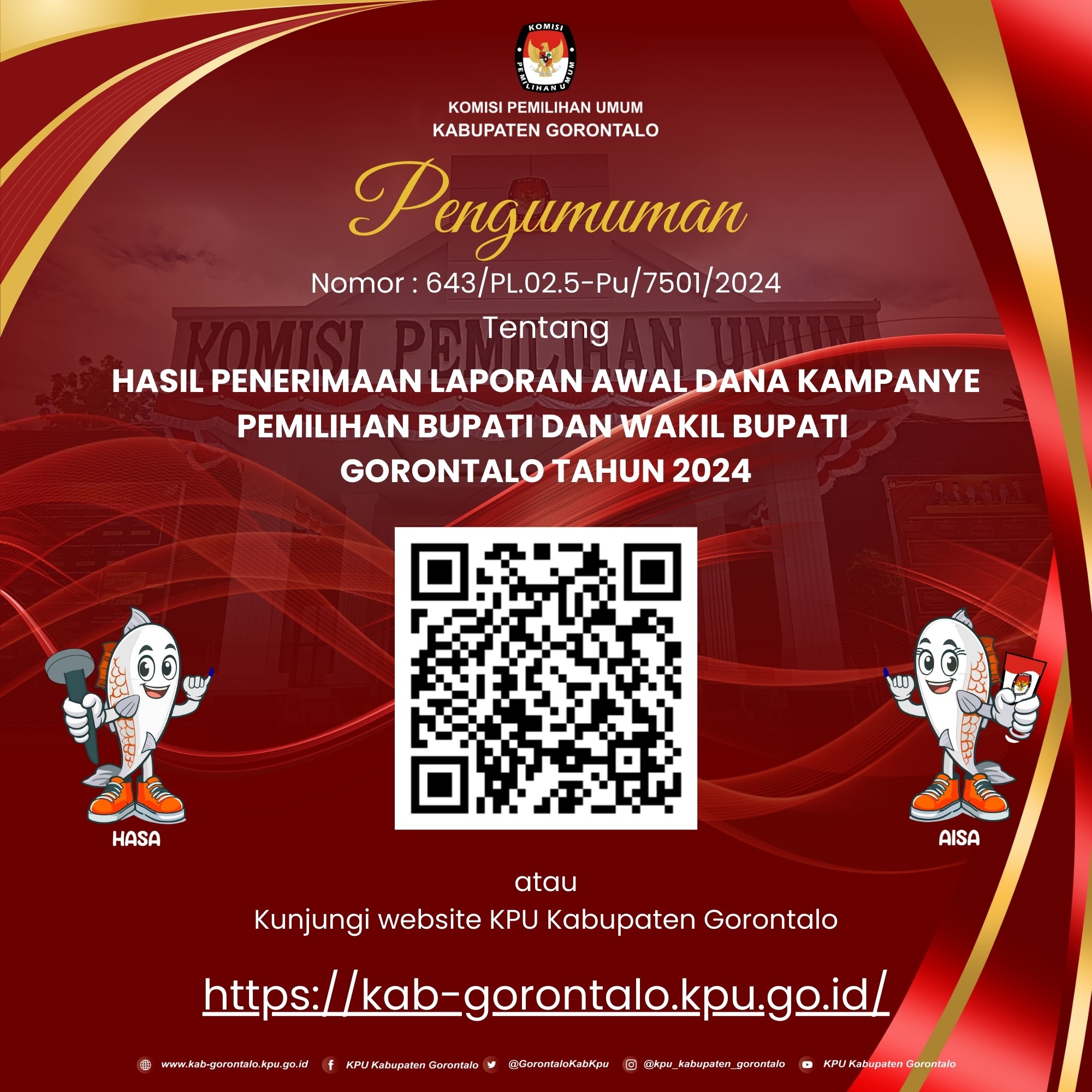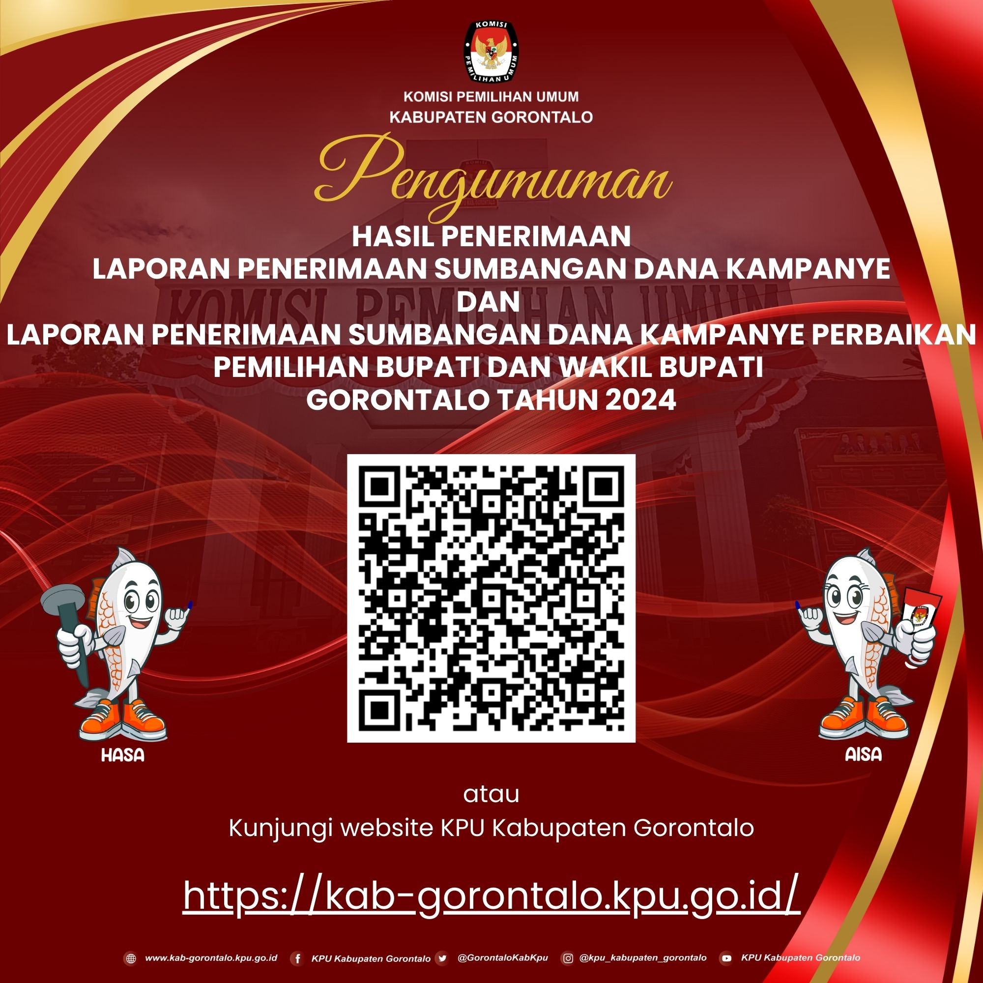 #TemanPemilih, Berdasarkan Peraturan Komisi Pemilihan Umum Nomor 14 Tahun 2024 tentang Dana Kampanye Peserta Pemilihan Gubernur dan Wakil Gubernur, Bupati dan Wakil Bupati, serta Walikota dan Wakil Walikota pasal 49 dimana KPU Provinsi dan KPU Kabupaten/Kota mengumumkan LPSDK dan/atau LPSDK Perbaikan pada Laman dan Media Sosial Resmi KPU Provinsi dan KPU Kabupaten/Kota, adapun informasi lebih lengkap terkait Laporan Penerimaan Sumbangan Dana Kampanye (LPSDK) dan/atau Laporan Penerimaan Sumbangan Dana Kampanye (LPSDK) Perbaikan Peserta Pemilihan Bupati dan Wakil Bupati Gorontalo Tahun 2024 dapat di unduh pada link di bawah ini. Pengumuman Nomor: 696/PL.02.5-Pu/7501/2024 tentang Hasil Penerimaan Laporan Penerimaan Sumbangan Dana Kampanye Pemilihan Bupati dan Wakil Bupati Gorontalo Tahun 2024 Pengumuman Nomor : 697/PL.02.5-Pu/7501/2024 tentang Hasil Penerimaan Laporan Penerimaan Sumbangan Dana Kampanye Perbaikan Pemilihan Bupati dan Wakil Bupati Gorontalo Tahun 2024
