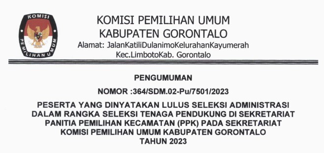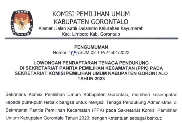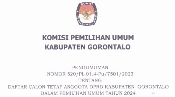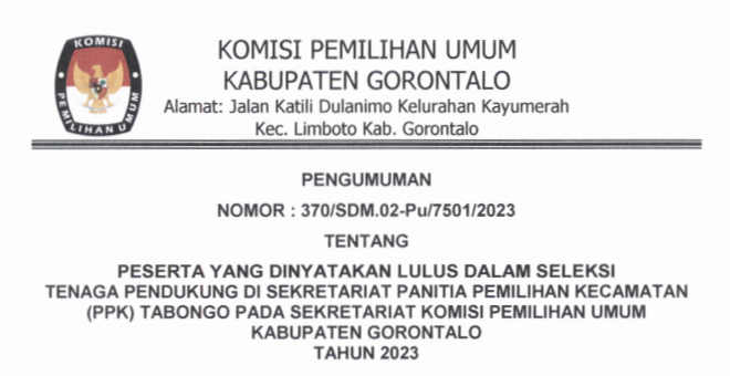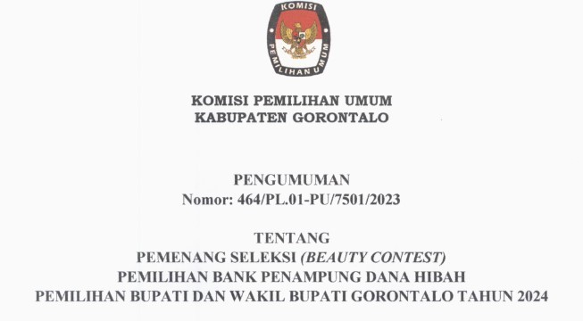 Untuk melaksanakan Pasal 12 Peraturan Komisi Pemilihan Umum Nomor 15 Tahun 2023 tentang Kampanye Pemilihan Umum yang menyatakan bahwa KPU Kabupaten/Kota mengumumkan nama tim Kampanye Pemilu Presiden dan Wakil Presiden sesuai dengan tingkatannya yang telah didaftarkan pada papan pengumuman dan/atau laman KPU, KPU Provinsi, atau KPU Kabupaten/Kota, KPU Kabupaten Gorontalo mengumumkan nama Tim Kampanye Pemilu Presiden dan Wakil Presiden Pemilihan Umum Tahun 2024 tingkat Kabupaten Gorontalo.